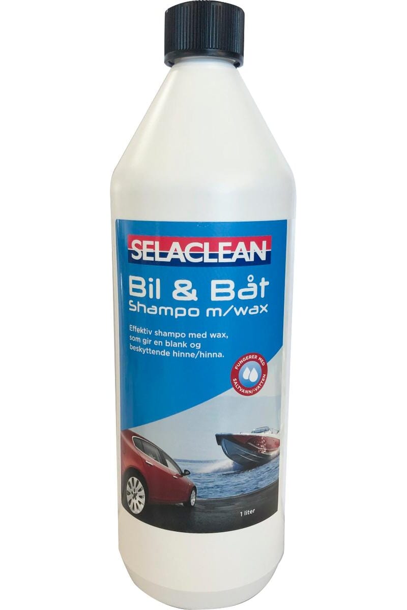 SELACLEAN BIL & BÅTSHAMPO M/WAX shampo konsentrat som inneholder Carnauba voks. Betyr at du vasker og legger igjen et beskyttende lag wax. Fjerner olje, fett, veisalt, smuss og trafikkfilm. Den er skånsom, og skader ikke polerte flater. Rekker til 35-40 bil – båtvask