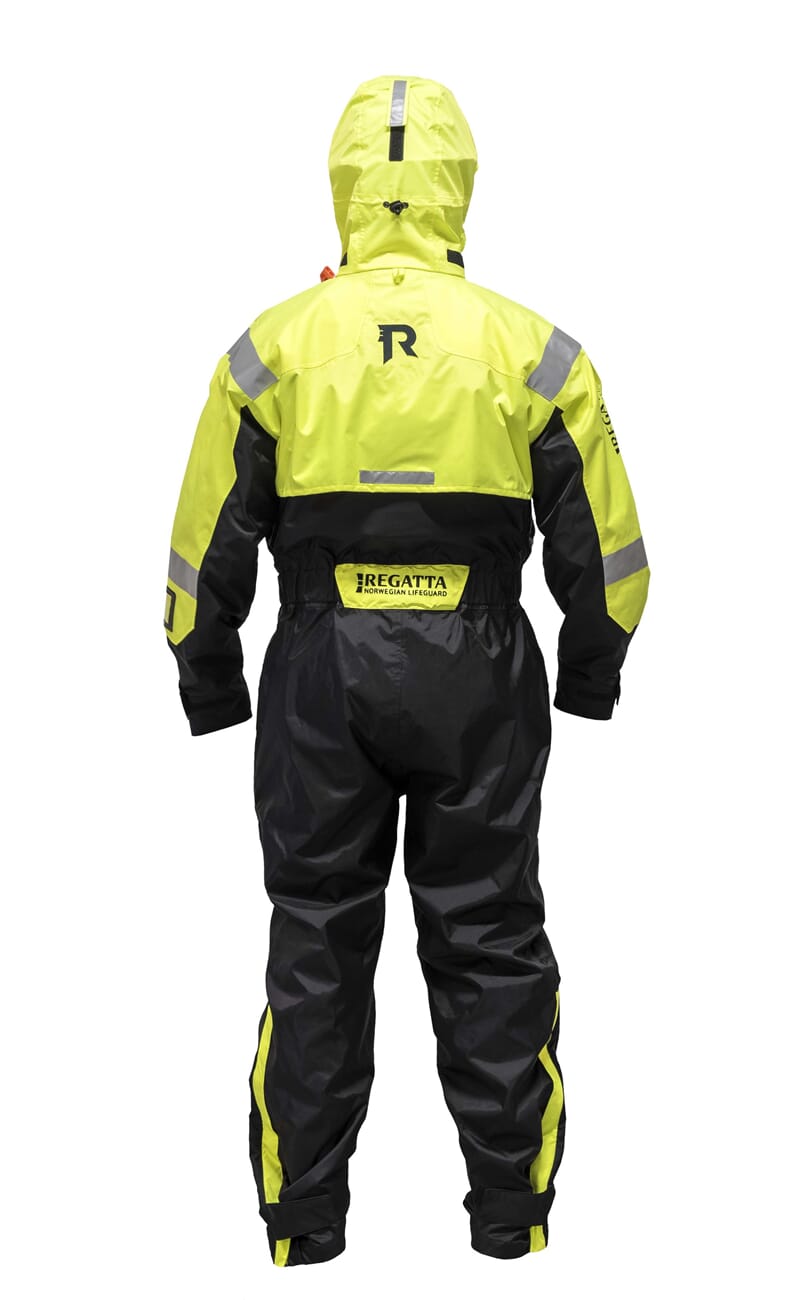 Regatta Sportline er en solid flytedrakt, med en overlegen passform. Den er ekstremt lett, samt bl.a ekstra lange glidelåser på beina med skråstilt borrelås for effektiv av- og påkledning. En vinner på komfort og funksjonalitet! Spesifikasjoner Oppdrift: 65N (L) Størrelser: XS - XXXXL Farge: Svart og fluoriserende gul. Vekt: Ca. 1,4 kg (L) Godkjenning: ISO 12402-5/6 50N, EN 15027-1:2002 klausul 4.11, Class D -Thermal Protection. Robust ytterstoff i slitesterk og vindtett/vannavisende nylon. Doble og tapede sømmer hindrer rifter og vannlekkasjer. Kraftig YKK glidelås i front Justérbare mansjetter i ermene stopper vanninntrengning. Ekstra lang glidelås-åpning på ben (45 cm), med kile og skråstilte borrelåser. Ventilasjons-åpninger under armene med vannavvisende glidelås. Justérbar fluoriserende gul hette som kan foldes inn i kragen. Fleece i kragen for økt komfort. ID-lomme på arm. Område for egenprofilering på rygg. Belte-hemper og stramming i livet. Feste for oppblåsbar redningsvest. Fløyte på skulder, samt D-ring i midjen.