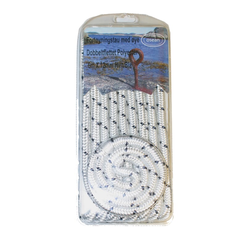 Dobbeltflettet fortøyningstau av meget høy kvalitet. Polyester. 12mm tau x6meter langt med spleiset øye.