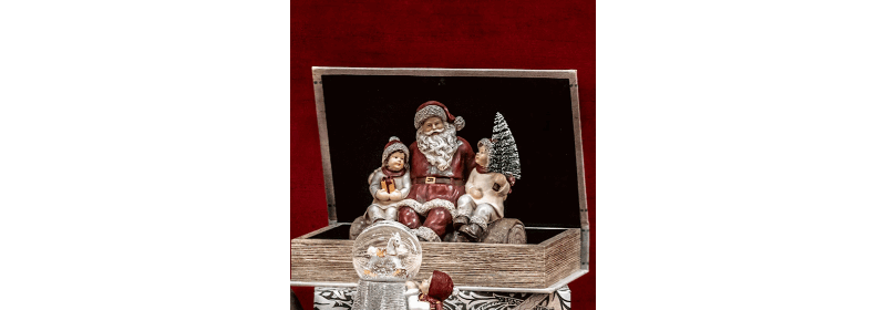 Nydelig og god nissefar som sitter og forteller eventuyr til 2 barn. 17cm. Plast.