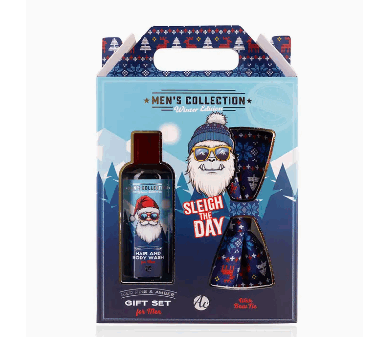 The gift set MEN'S COLLECTION WINTER EDITION in a gift box contains 100ml Hair & Body Wash and a stylish bow tie, accompanied by the masculine scent of Iced Pine & Amber. Perfect for your husband, brother, or father who appreciates well-groomed skin and stylish accessories and loves winter care.