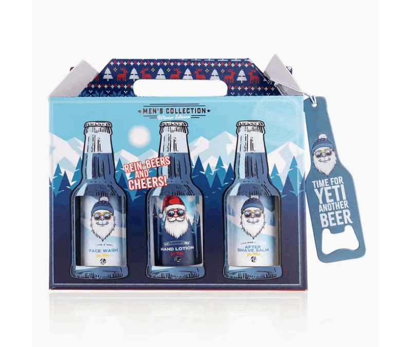 Accentra Gift Set for Men – MEN'S COLLECTION WINTER EDITION in Sixpack Gift Box, includes 100ml Body Wash, 100ml Hand Lotion, 100ml Face Wash, 100ml Face Lotion, 100ml Shampoo, 100ml After Shave Balm, and Bottle Opener, Scent Iced Pine & Amber. Perfect care set for husband, son, brother, or father – stylish, practical, and ideal for the winter season.