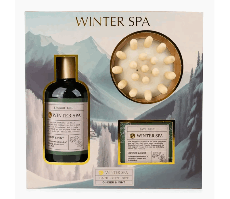 Wellness Gift Set WINTER SPA in Gift Box Bath Set Wellness WINTER SPA in Gift Box, incl. 150ml Shower Gel, 80g Bath Salt, Wooden Massage Brush, Scent: Ginger & Mint, Color: green/gold/gray, PU 6/24 Exceptional gift accessories for care, bath, and cosmetics: This is the great strength of Accentra.