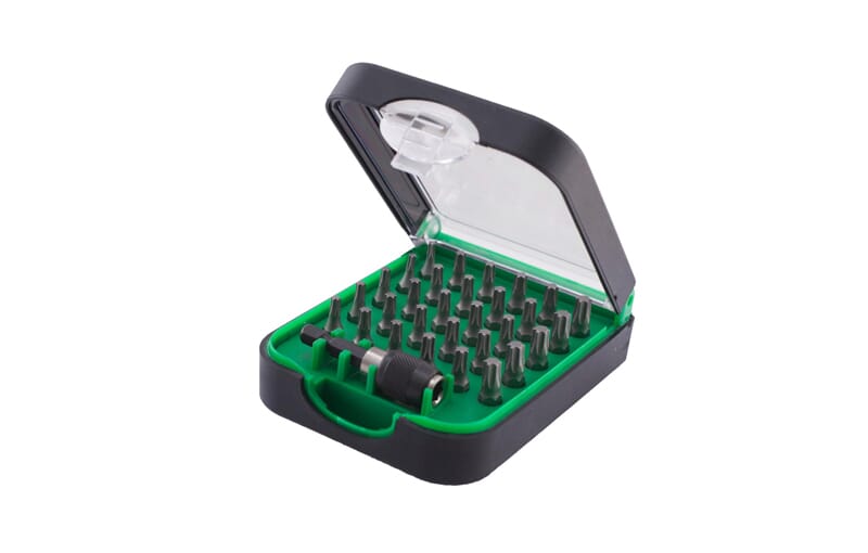 Innholdet er tilpasset de mest brukte bitsdimensjoner. Påmontert belteklips. Transparent lokk.
