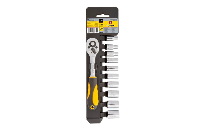 Pipenøkkelsett 1/4" 140mm håndtak, ergonomisk plasthåndtak med anti-glipp belegg. 10 sekskantede nøkler i størrelser: 4, 5, 6, 7, 8, 9, 10, 11, 12, 13 mm. I plastetui. CRV-stål.