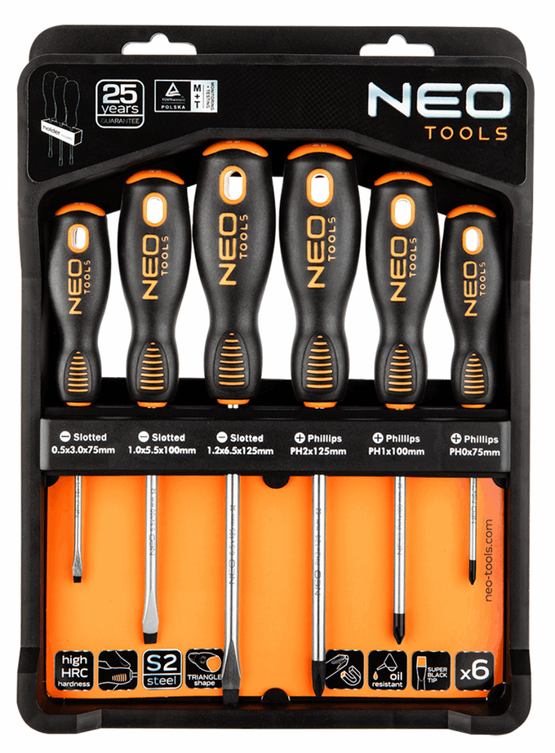 Skaftet i slitesterkt S2-stål. Bladet ble varmebehandlet for å oppnå passende hardhet og motstand mot bøyning. Magnetisk spiss. Trilobulær håndtaksform med profilert tommelstøtte gjør det lettere å få riktig dreiemoment. Håndtak i to materialer forhindrer skrutrekkeren fra å skli i hånden, den er også motstandsdyktig mot kjemikalier, oljer og fett. 25års produsentgaranti.