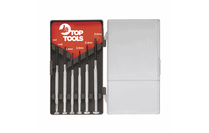 Urmakersett i 6 deler i plastboks. Flat 1,4mm, 2mm, 2,4mm, 3mm, PH0, PH1
