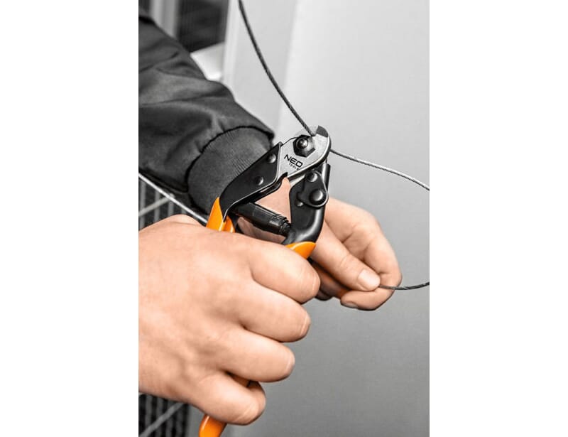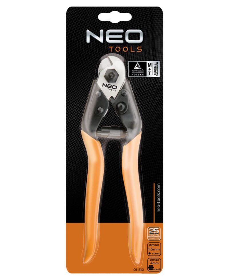 Herdede kjever kan kutte stålkabler opp til 1,5mm i diameter og ståltråder opp til 4,0mm i diameter. Krom vanadiumstål av høy kvalitet garanterer holdbarhet i mange år. Ergonomisk og PCV-belagt håndtak forbedrer brukskomforten. Verktøyskvalitet bekreftet med TÜV-sertifikat og 25 års produsentgaranti. NEO merkevare oppfyller forventningene til fagfolk.