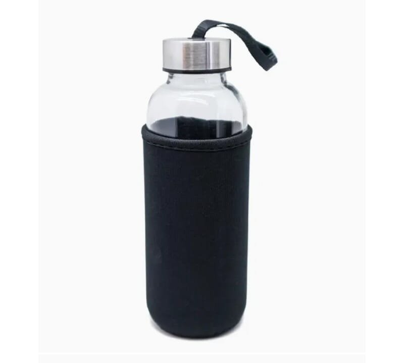 Glassflaske med god tett kork og heng i korken. Kommer med trekk for å holde drikken kald (kan taes av)