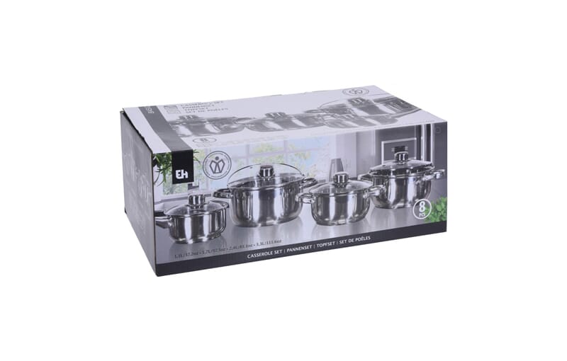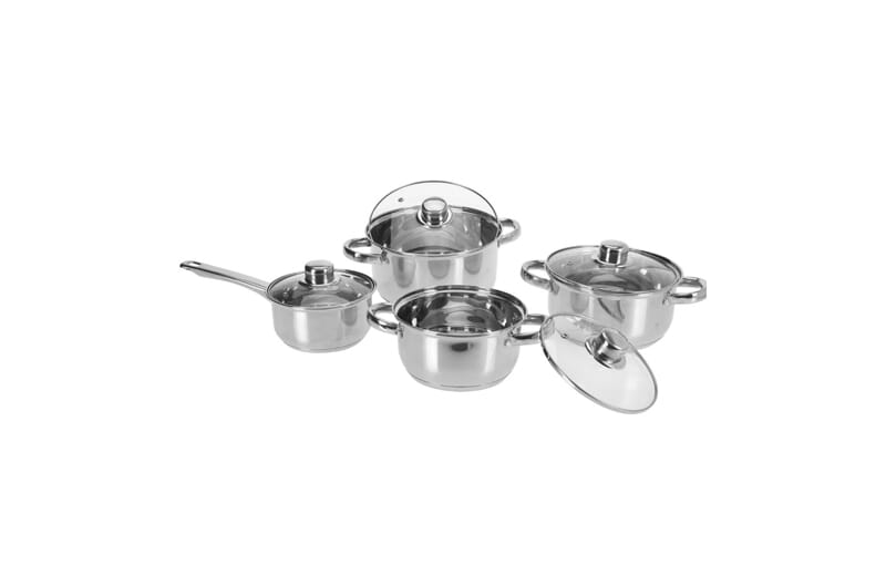 8 delers grytesett i rustfritt stål. 4 gryter og 1 kasserolle, alle med glasslokk med hull for utslipp av damp. 1,1L, 1,7L, 2,4L og 3,3L. Passer for alle varmekilder også induksjon, og kan vaskes i oppvaskmaskinen.