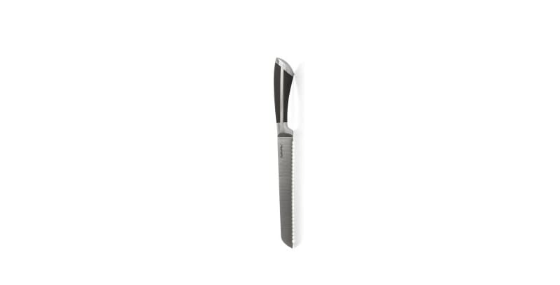 Brødkniv GastroMax 33,5 cm Solid kniv i rustfritt stål Gripevennlig gummiert håndtak Håndvask anbefales Mål: 33,5 cm Farge: Svart Materiale: Stål, Gummi Serie: GastroMax Forpakning: Blister Nobbnr: 52527345
