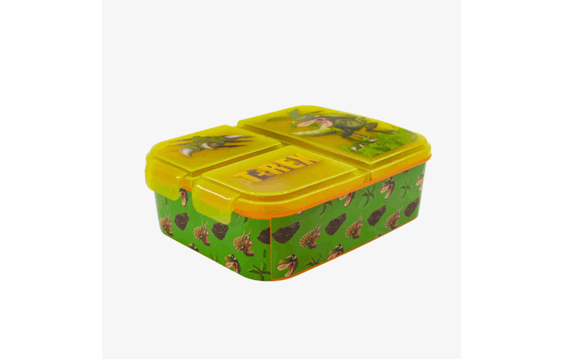 Kul matboks med dinosaurus. Inni er det 3 rom.