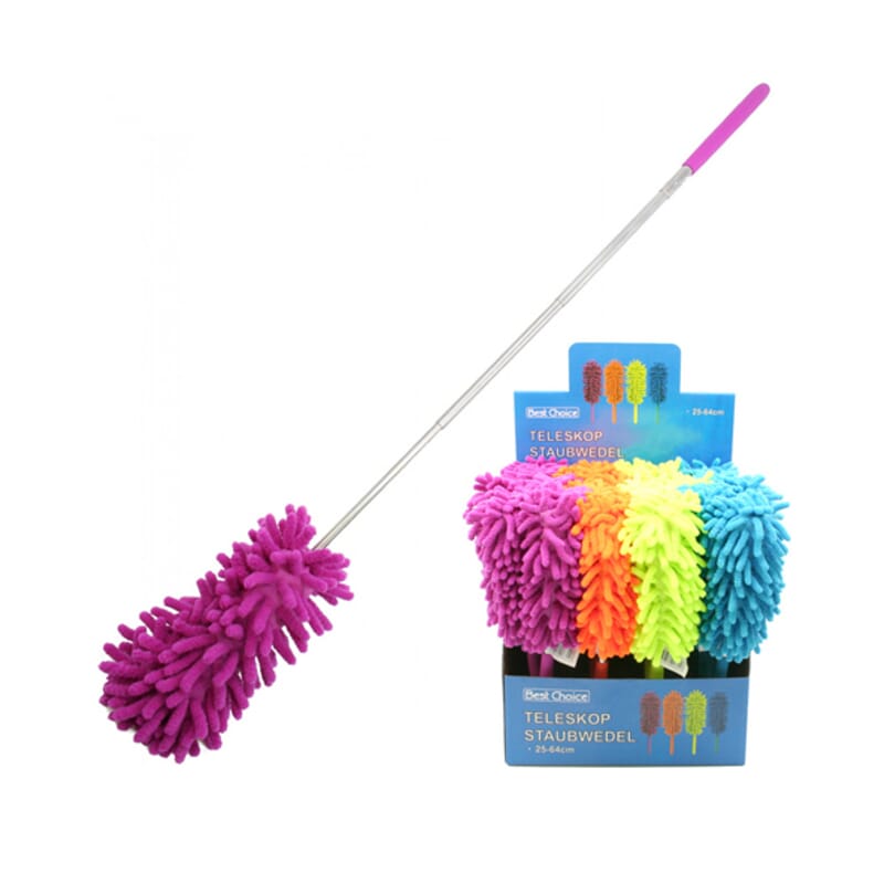 Støvkost med teleskop stang. Kan bli opptil 57cm lang. Selve støvkosten er i microfiber som trekker til seg støv. Tilfeldig hvilken farge man får tilsendt og vi har på lager.