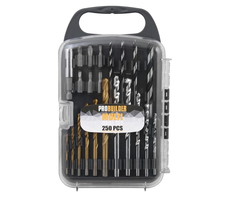 Borsett 250 deler Probuilder 6 stk. spiralbor – 2-8mm. Titanium 5 stk murbor – 4-10mm. Carbon steel 4 stk. trebor – 4-8mm. Carbon steel 6 stk bits 60 stk treskruer Plugger mm