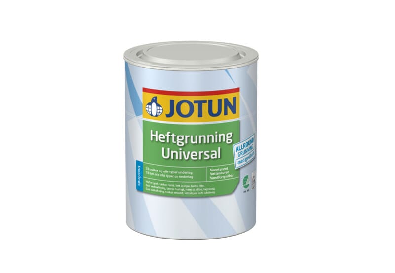 JOTUN HEFTGRUNNING UNIVERSAL er en grunning med gode heftegenskaper til de fleste underlag. Produktet hefter og fyller godt, er lett å slipe og gir et godt underlag for overmaling. Tørker raskt. Brukes på de fleste innendørs underlag hvor heft kan være vanskelig f.eks. metall, laminatplater, malte blanke flater, harde plaster og fliser i tørre rom samt bygningsplater og innendørs treverk.