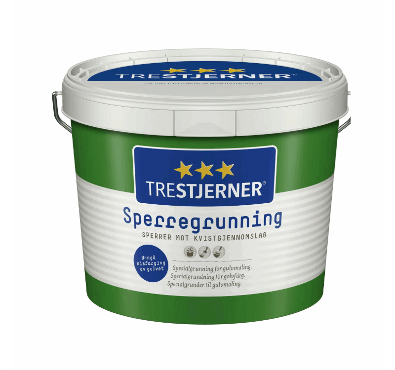 TRESTJERNER Sperregrunning er en vanntynnet hvit spesialgrunning for gulvmaling basert på modifisert epoksyharpiks. Sperrer mot gjennomslag fra kvister og fargestoffer i treverket. Benyttes innendørs på nye, nedslipte og tidligere behandlede tre- og parkettgulv og trapper med behov for sperring og kvistlakk under Trestjerner Gulvmaling.
