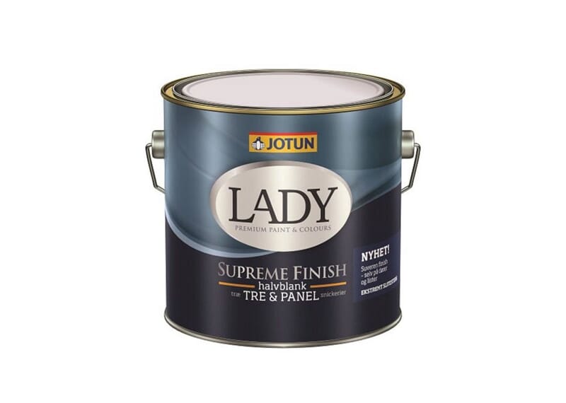 LADY Supreme Finish er markedets beste maling til tre og panel. Hele LADY Supreme Finish-serien er fornyet med enda bedre påføringsegenskaper og suveren flyt. Nyheten LADY Supreme Finish Pure Matt er en enda mattere og vakrere penselmaling med suveren og forsterket slitestyrke. Ekstrem slitestyrke gir vakker fornyelse som varer. Velg mellom fire ulike glansgrader (Pure Matt, Silkematt, Halvblank og Superblank) til detaljer og listverk, gamle møbelskatter og panelvegger. Fremhev med en høy glansgrad, eller velg nye LADY Supreme Finish Pure Matt for et diskré og sobert uttrykk.