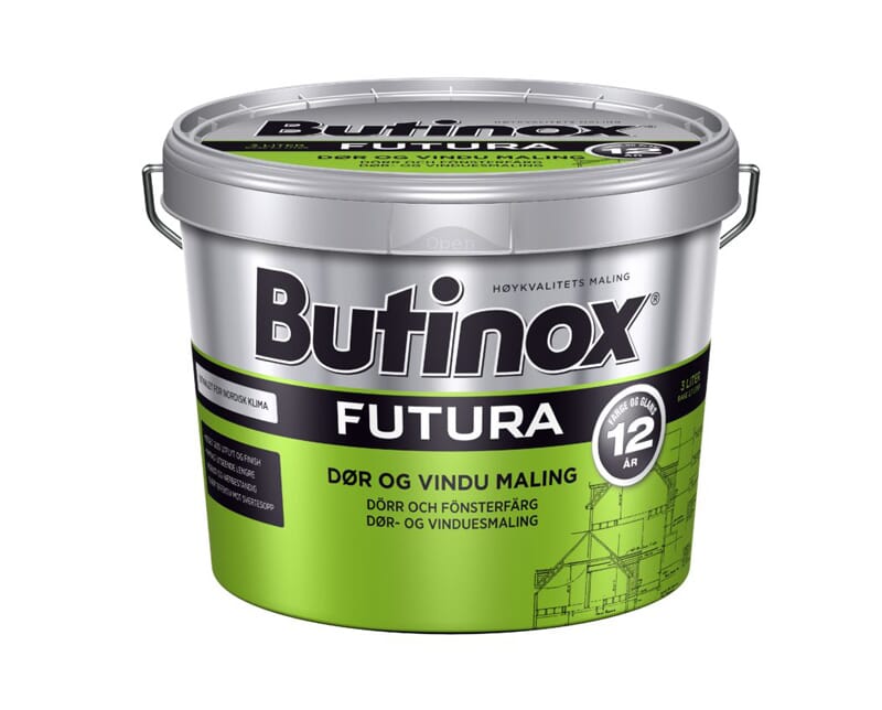 Butinox Futura Selvrensende Dør og Vindu er en vanntynnet spesialmaling til dør, vindu og detaljer av høvlet treverk. Den selvrensende malingen gir suveren finish og 12 års garanti på farge og glans. Dette gir langvarig nymalt og rent utseende, samt effektiv beskyttelse mot sopp og alger. Spesialmalingen gir en hurtigherdene og klebefri overflate for dører og vinduer som skal lukkes og åpnes.