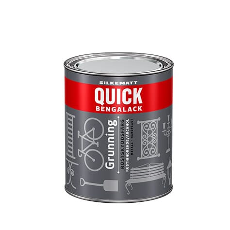 Rusthindrende grunning. Quick Bengalack Grunning er perfekt som grunning under Quick Bengalack Universal. Påfør 2 strøk av hver og du vil ha en meget god beskyttelse mot vær og kulde. Den er utviklet til bruk på alle underlag av metall. Siden den fyller godt sikrer den god vedheft også på andre underlag som tre og hardplast. Grunningen gir et silkematt utseende og kan benyttes som toppstrøk. Påregn da 3 strøk.