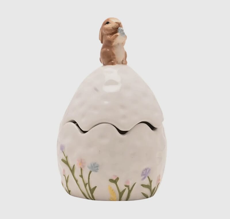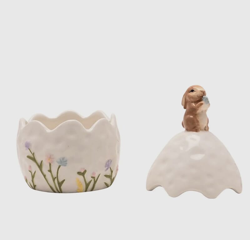 Dette dekorative smykkeskrinet med kanin og egg er en del av The Eggs-traordinary Gifting Co og passer perfekt i sesong- og påskesortimentet. Skrinet er laget i keramikk og har et lokkformet egg med fine blomsterdetaljer og en søt kaninfigur på toppen.