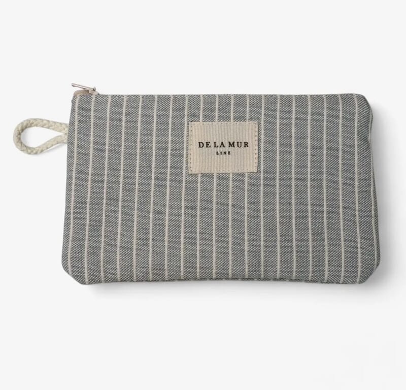 Liten pouch med glidelås øverst og et lite håndtak i råfarget snor på siden. Laget av fint stoff med stripemønster i gråtoner på akvagrønn bakgrunn. Hvert produkt kan ha små variasjoner i mønsteret, avhengig av hvor stoffet er klippet. Fôret med kraftig grått stoff på innsiden.