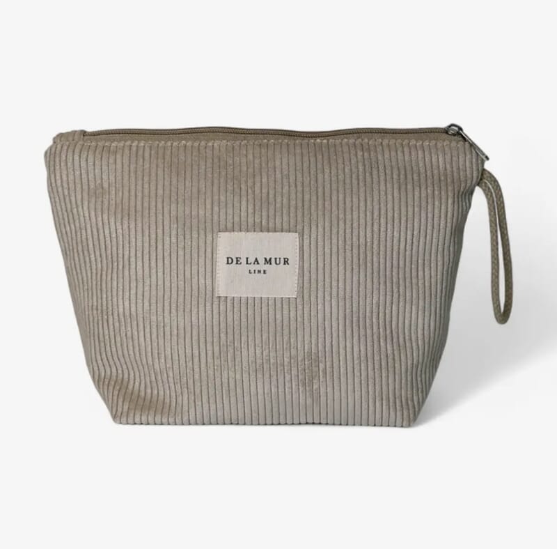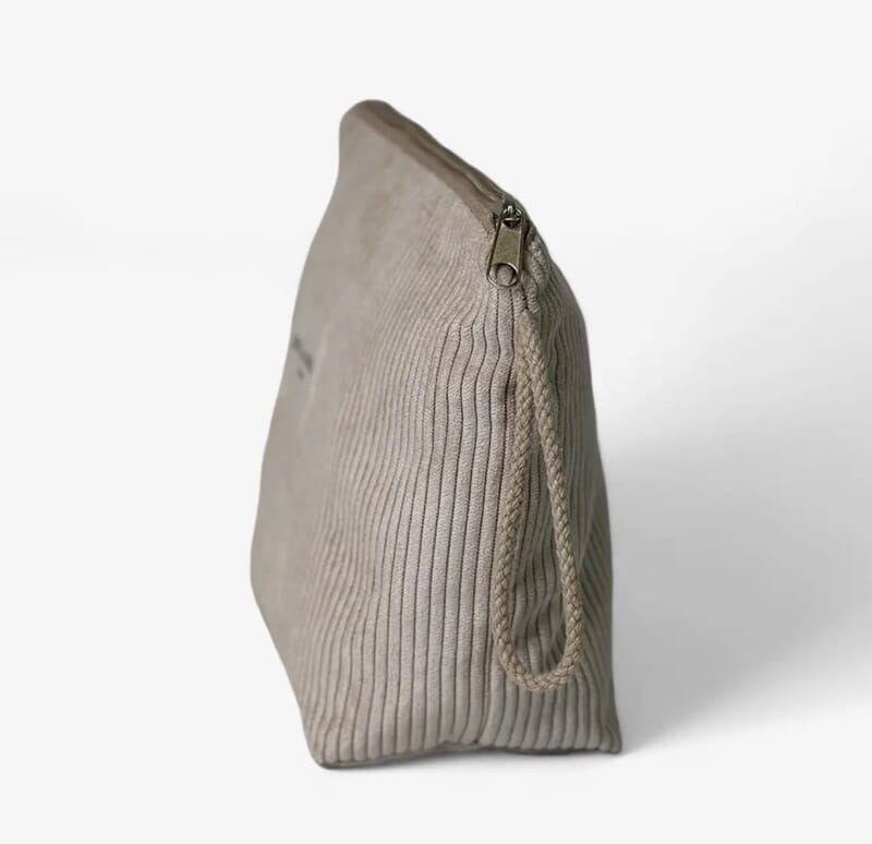 Toalettmappe med glidelås øverst og et beige snorhåndtak på siden. Laget av kraftig kordfløyel i beige. Fôret med tykt grått stoff på innsiden.