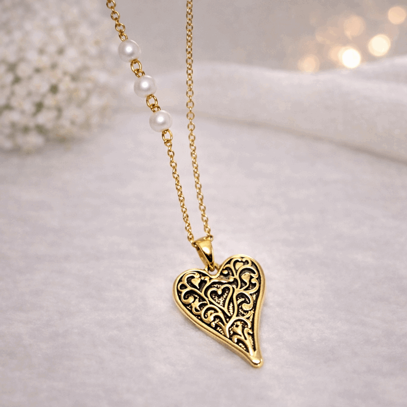 Halvlangt, antikk gullfarge, perler og Hjerte med mønster Flotte detaljer Norsk design fra oss i Hjerter Lengde - 53cm + forlenger på 5,5cm Anheng 3 x 2,2cm