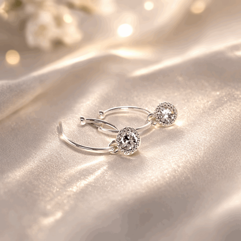 Sølvfarget ring, med klar sten Ring = 2 cm. Sten = 0,8 cm.