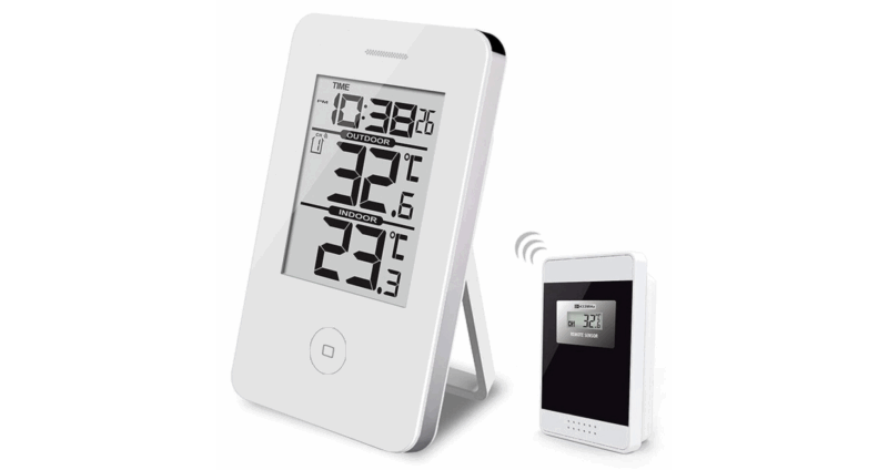 Viking tråløst termometer inne/ute Digitalt trådløst ute/inne termometer samt klokke. Sensoren for utetemperaturen plasseres ute og sender trådløst inn til mottakeren via 433 MHZ. Innendørs måleområde -10 til +50°C og et utendørs effektområde på -50 til +70°C Trådløst Maks/min temperaturregistrering Integrert klokkefunksjon